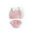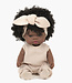 Das ist die Minikane-Puppe Sweety, eine der Loretas! Jede Loreta-Puppe steht für eine Jahreszeit, Sweety für den Frühling. Ihr beige Puppenanzug, ihre Hausschuhe und ihr Haarband sind aus Bio-Baumwolle handgefertigt. Unter ihrem schönen Outfit trägt sie ein rosa Hemd und eine Hose.