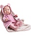 Das Puppenmädchen trägt eine rosa Puppenjacke mit Bärenohren, eine rosa Hose und liegt in einer rosa Puppendecke.