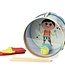 Retro-Spielzeuge machen immer noch Spaß! So auch diese Metall Trommel von Vilac mit einer Illustration von Menschen in einem Karussell. Die Kindertrommel hat einen Durchmesser von 17,5 cm und verfügt über einen verstellbaren Schultergurt. Natürlich gibt es auch zwei Trommelstöcke. Die Außenseite besteht aus Metall und das Trommelfell ist transparent. In der Trommel befinden sich zwei Bälle, die man beim Trommeln hin und her gehen sehen kann.