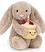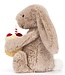 Jellycat Bashful Bunny Birthday with cake is a silky soft bunny soft toy with beige fur, long floppy..