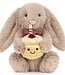 The soft beige fur and friendly snout make this cuddly bunny irresistible. A striped candle and small suede flame add a festive touch. Whether a gift for a child, a friend or just for yourself, this Jellycat bunny is sure to bring a smile to anyone's face.