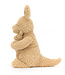 Jellycat Kangaroo soft toy Huddles is a large light brown kangaroo measuring 26 cm. In her arms she holds a small baby kangaroo. Both animals are brown and have soft fluffy fur. The stuffed animal is stuffed at the bottom so she sits upright well.