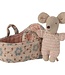 Beautiful Maileg baby mouse in a baby carrier. A super cute toy! The baby mouse is wearing a pink suit. The baby carrier she is lying in is made of fabric. The inside is pink and the outside has a floral pattern. The baby carrier measures 9 x 5.5 x 6 cm. Read more..