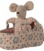 Super cute Maileg toy set consisting of a baby mouse and a carry cot. This little mouse girl wears an adorable pink knitted suit. Her mouse parents take her everywhere with them in her travel cot. It is a practical Maileg carry cot in which the mouse mother can transport her mouse baby. This means the baby mouse can sleep comfortably anywhere.