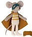 This is Maileg Super Hero Mouse, a little brother who lives in a matchbox. He gives a little extra power to anyone who can use a little help! He wears a golden cape and a blue mask. When he goes to sleep, you can put on his sleeping mask.