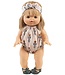 Minikane Barboteuse Clara Fleurs is a beige doll's suit with a matching hairband with bow. It is made from organic cotton and has a floral print. The French brand is known for its unique doll's clothing for Gordi dolls.