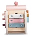 The Moulin Roty activity teapot is a wooden toy for children aged 10 months and up. Each of the four sides offers fun activities: an abacus, a shape sorter, gears to turn and a xylophone. There is even a small hidden mirror! Read more..