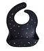 A cool Mushie bib in navy with white planets. The dark blue bib is light in weight, has a deep front..
