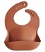 Silicone bib from Mushie in the color Clay. The brown bib is light in weight, has a deep front pocke..
