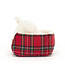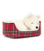 Een speelgoed hond in hondenmand, dat is de Jellycat Napping Nipper Westie. De witte knuffel hond ligt in slaaphouding in zijn zachte hondenmand.