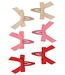 Zes hele mooie haar speldjes met stoffen strikjes van het Scandinavische merk Konges Slojd. Er zijn twee beige, twee roze en twee rode clips. Allen hebben een stoffen strikje met ribmotief.