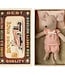 De Maileg muis kleine zus ziet er prachtig in haar roze pyjama. Ze slaapt graag in haar luciferdoos. Het doosje is haar bedje en is voorzien van een deken, kussen en matras.