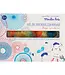 De set bestaat 3 grote sjablonen met 1 verkleining en 8 kleine tandwielen en een vierkant sjabloon met 4 grote tandwielen. De tandwielen zijn geschikt voor kleurpotloden en stiften.