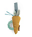 De speelgoed wordt heeft aan de binnenzijde kleine kraaltjes, als je de wortel beweegt hoor je dus een lief geluidje. In het loof zit knisperpapier. Aan de bovenzijde zit een lusje met klittenband zodat je de wortel ergens aan kunt bevestigen.
