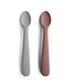 Deze twee Mushie babylepels in de kleur stone en cloudy mauve zijn de ideale lepels voor de eerste h..