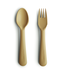 Het Mushie kinderbestek Mustard bestaat uit een lepel en een vork en is mooi door het minimalistisch..