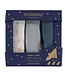 Nobodinoz swaddle set Blue bestaat uit drie hydrofiele doeken van 70 x 70 cm. Er is één witte swad..
